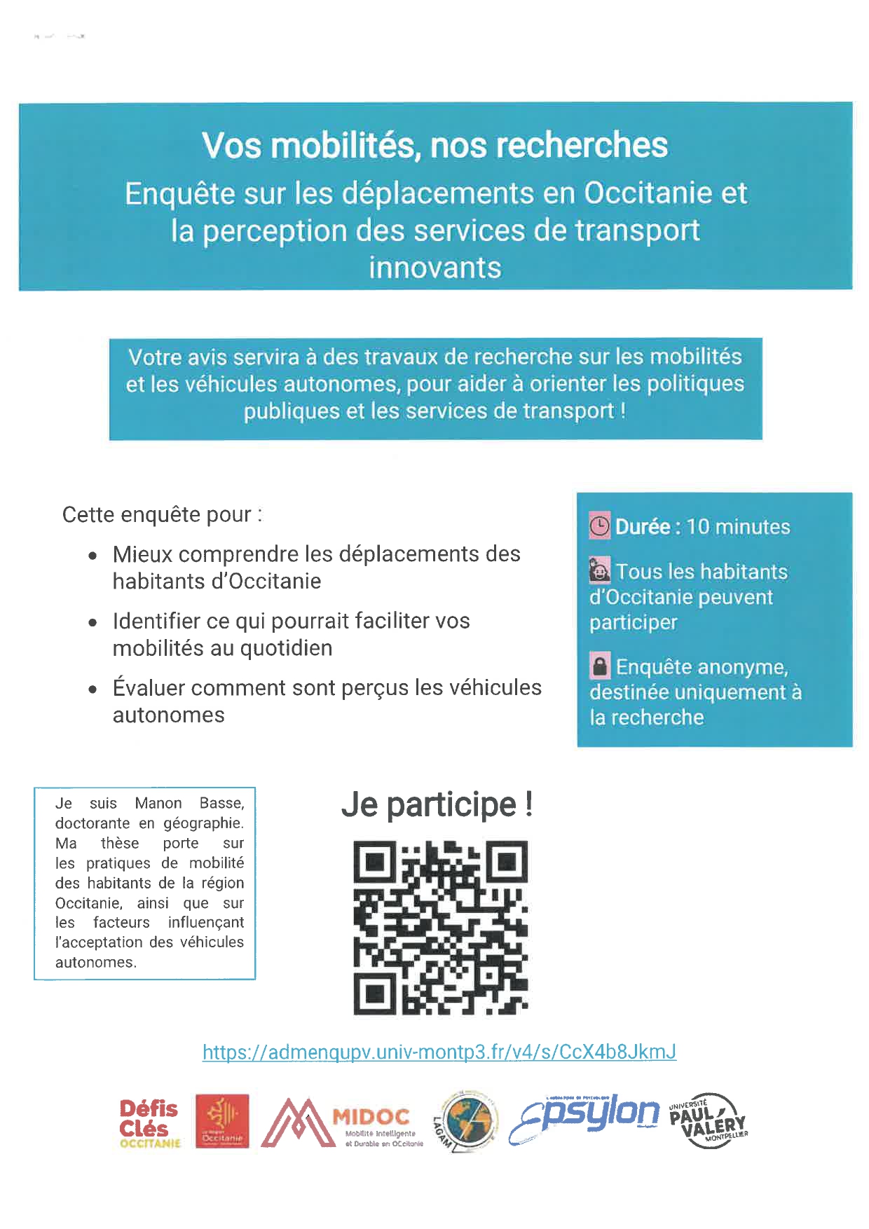 Votre avis servira à des travaux de recherche sur les mobilités e1 les véhicules autonomes, pour aider à orienter les politiques publiques et les services de transport ! Cette enquête est pour :