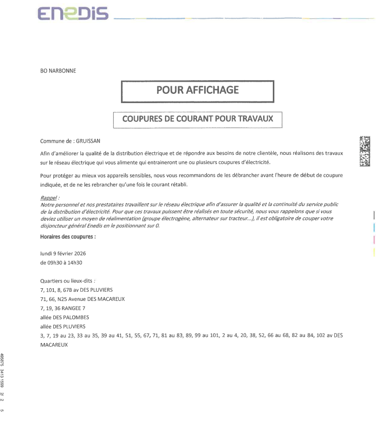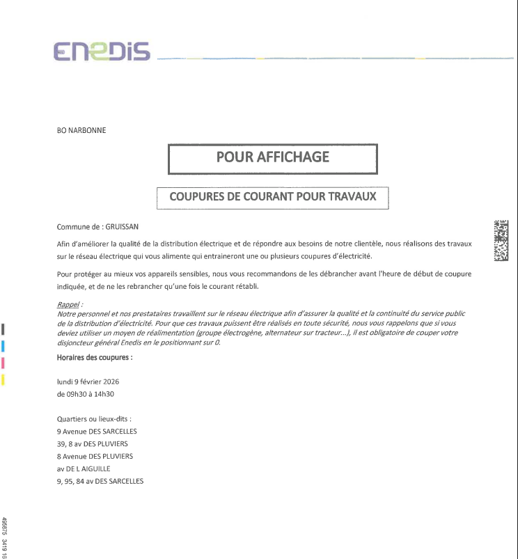Coupure d’électricité pour Travaux le lundi 09/02/2026 par ENEDIS – Chalets de 9h30 à 14h30
