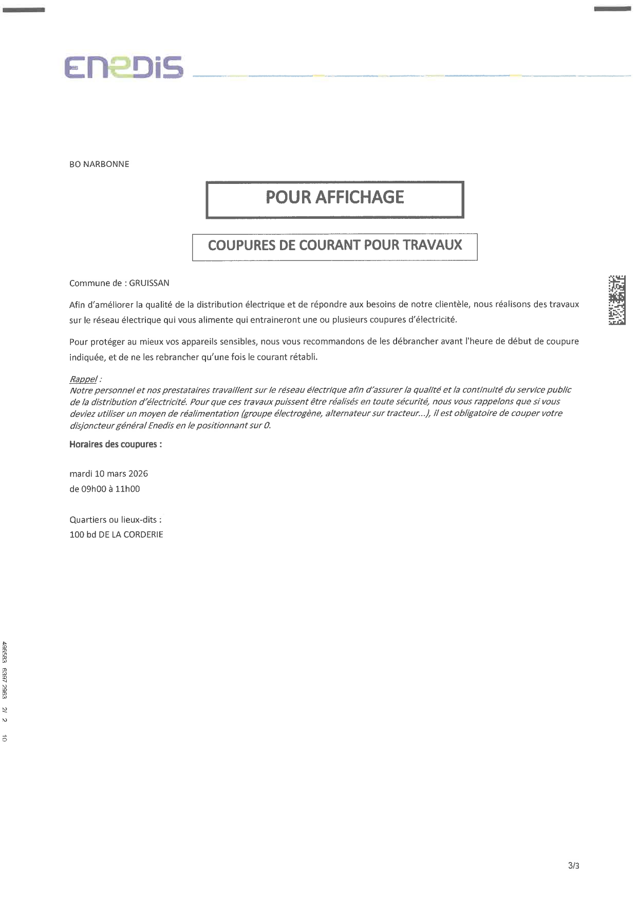 Coupure d’électricité pour Travaux le mardi 10/03/2026 par ENEDIS – 100 & 135 Bd de la Corderie de 09h à 11h