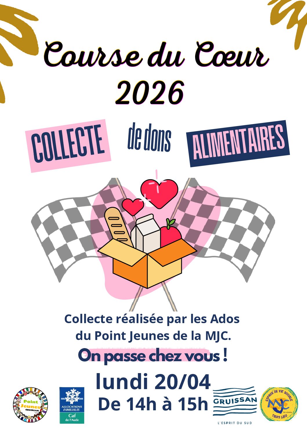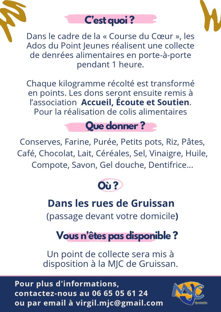 Le lundi 20 avril, de 14h à 15h, les adhérents du Point Jeunes de la MJC de Gruissan participeront à la course du cœur, en compétition avec d’autres MJC du département.