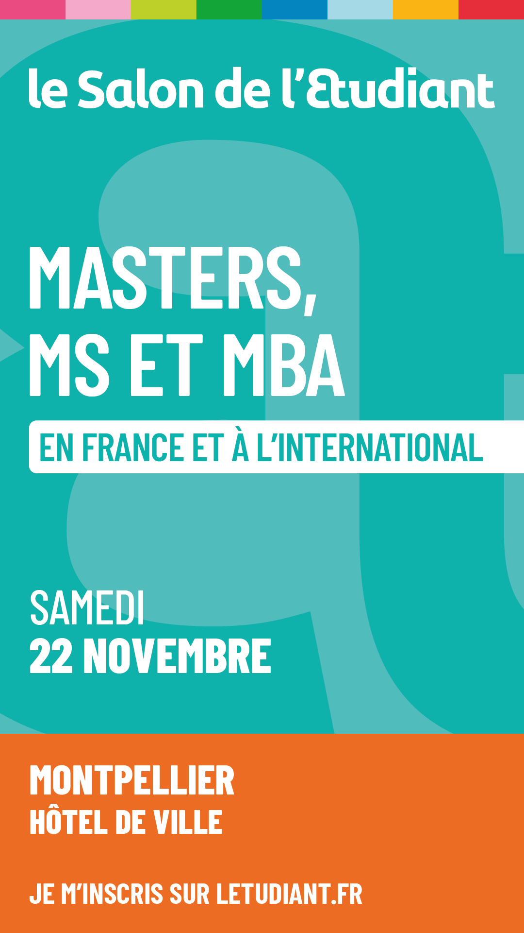 Le Salon masters, mastères spécialisés et MBA en France et à l’international à Montpellier ouvrira ses portes pour sa 1ère édition le samedi 22 novembre 2025 à l’Hôtel de Ville ! Véritable lieu d’échanges et de découvertes, cet événement incontournable de l’enseignement supérieur est organisé en partenariat avec la région académique Occitanie. Partageant la mission commune d’accompagner les jeunes vers une orientation réussie, nous serions heureux de pouvoir compter sur votre soutien pour partager cet événement auprès des jeunes et de leur famille.