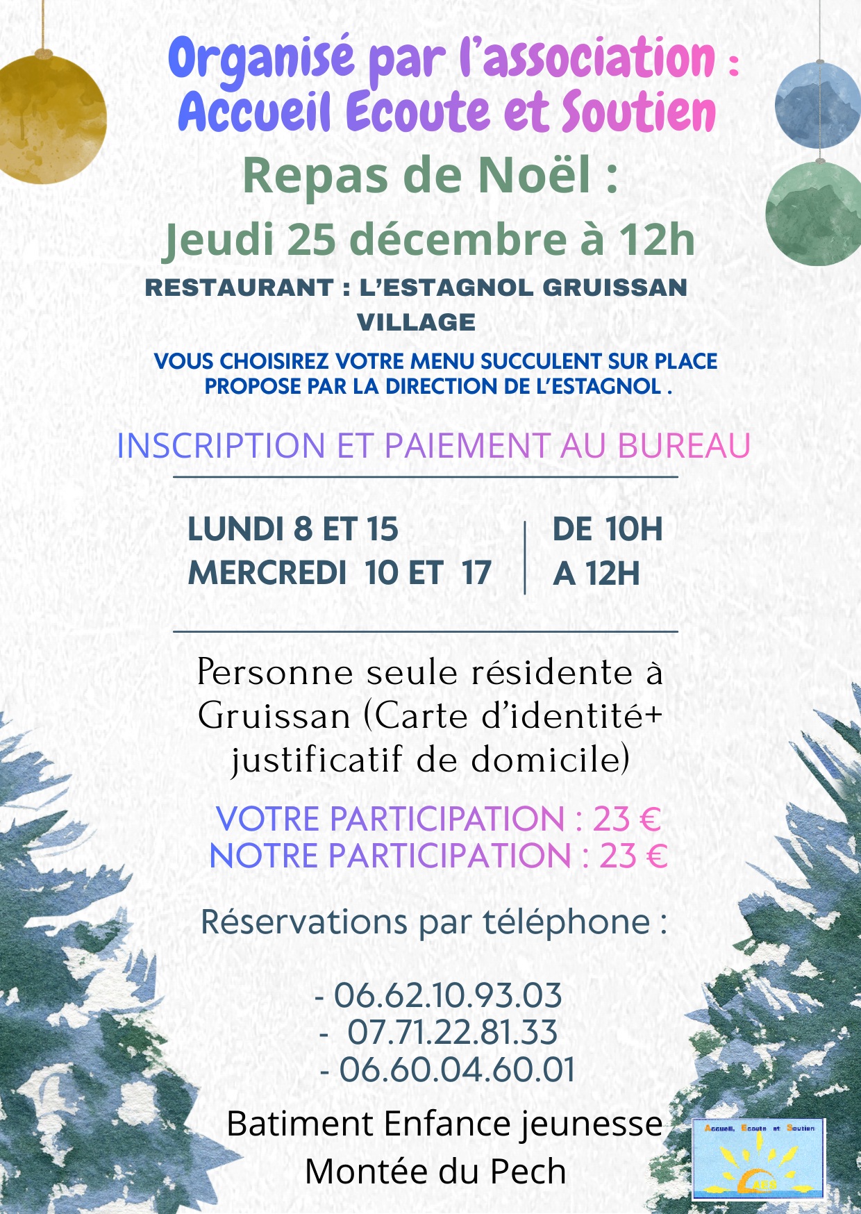 L’association Accueil Ecoute et Soutien fidèle à ses engagements, vous propose le jour de Noël de partager un repas festif au restaurant l’Estagnol. Ce repas convivial qui permettra de se sentir lié aux autres, vous est proposé si vous vivez seule ou seul et résidez à Gruissan.